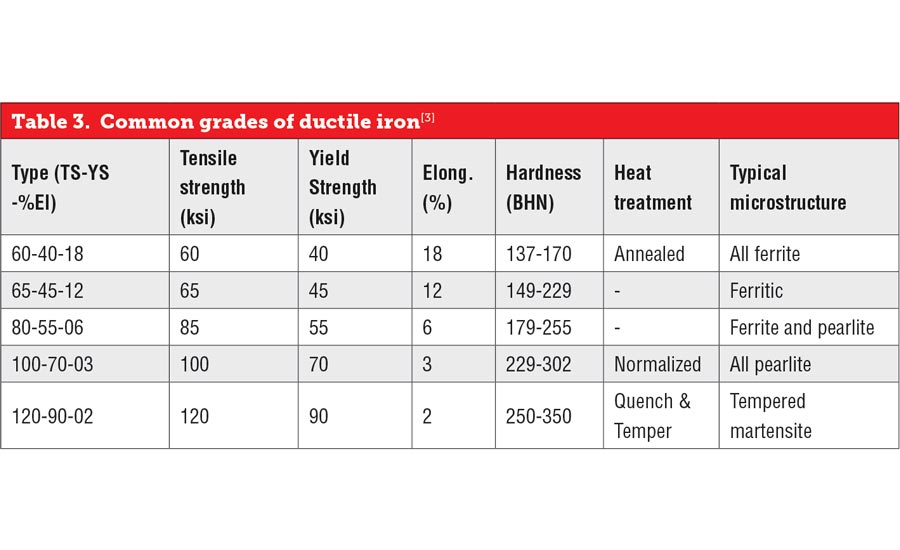 Ductile or nodular iron, also known as spheroidal graphite iron, is cast iron in which the graphite is present as tiny balls, or spherulites, instead of graphite flakes (as in gray iron) or compacted aggregates (as in malleable iron). The nodular irons typically contain from 3.2-4.1% C, 1.8-2.8% Si and up to 0.80% Mn as major constituents. Several types of matrix structures (including ferritic and pearlitic) can be developed by alloying and heat treatment. The various grades of regular, unalloyed ductile iron are designated by their tensile properties (Table 3).