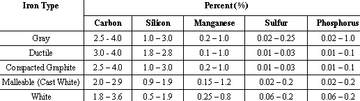 Cast irons come in a variety of types, however these cannot be specified by chemical composition because of the similarities between the types. The table given below shows the distinctive composition ranges for the most frequently determined elements in the 5 generic types of cast iron.