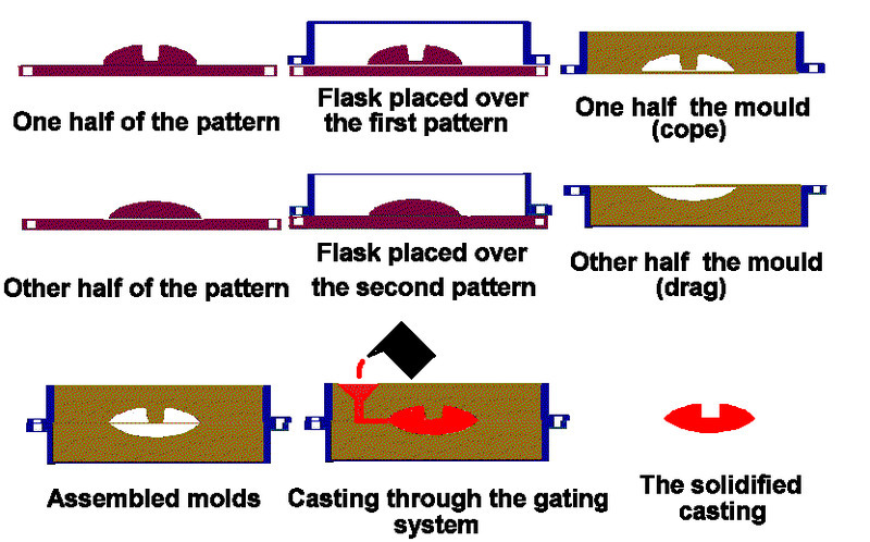 Sand casting is a casting process by which sand is used to create a mold, after which liquid metal is poured into this mold to create a part. To learn about the other forms of casting, visit our article on the types of casting processes. Sand is used in this method because it insulates well, it is relatively cheap, and it can be formed into any number of mold shapes. There are defined steps to this process (shown simplified in Figure 1), and this article will walk through each of these steps to illustrate exactly how this casting procedure is conducted.