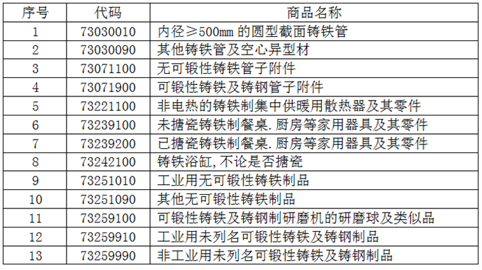 表1:13个税则号黑色铸件