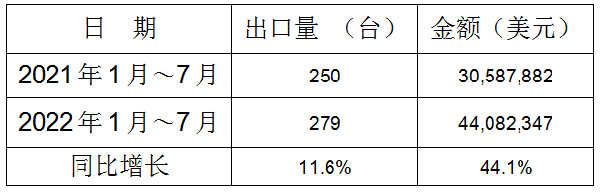 1-7月冷室压铸机共计出口279台,同比增长11.6%。其中:7月份出口54台,同比增长29.0%,环比增长-1.8%,见表9和表10。