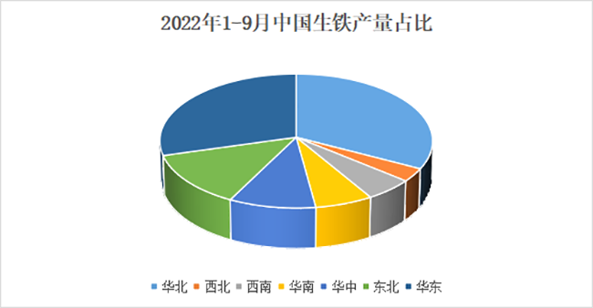 中国生铁主要集中在华北、华东地区生产;2022年1-9月中国生铁产量大区分布不均衡,其中华北地区产量最高,其中河北省占比23.17%。